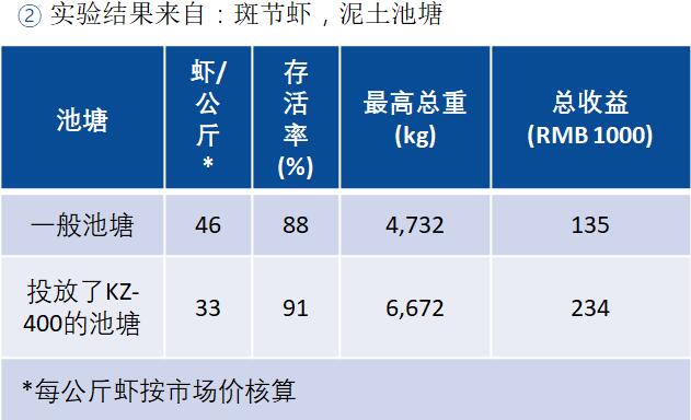 关于白虾和老虎虾的试验结果表明KZ-400水质净化剂在关于白虾和老虎虾的养殖上有巨大的成果和经济效益。